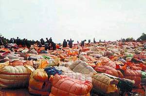 連日來,陸豐、碣石等三級黨委、政府針對陸豐碣石鎮(zhèn)瘋狂走私洋垃圾衫一事,積極組織包括海關(guān)、邊防、公安、工商等專項隊伍,出動1000余人次,對陸豐碣石鎮(zhèn)的所有市場、村莊等采取逐家清查的地毯式清理。到昨天為止,共查獲洋垃圾衫達1200捆、近100噸。