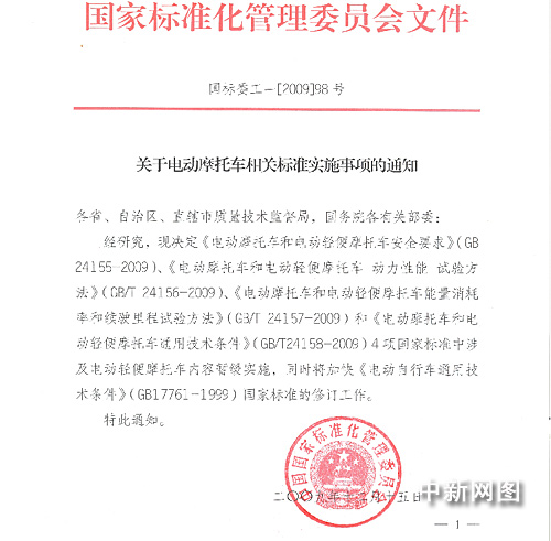 通知稱,2009年12月15日,國家標(biāo)準(zhǔn)化管理委員會會同國務(wù)院有關(guān)部門和行業(yè)協(xié)會,共同研究了《電動摩托車和電動輕便摩托車通用技術(shù)條件》等4項國家標(biāo)準(zhǔn)的相關(guān)問題?紤]到目前電動摩托車是一個新興的產(chǎn)業(yè),制定好一系列相關(guān)配套政策還需要一個過程,經(jīng)研究決定,標(biāo)準(zhǔn)中涉及電動輕便摩托車的內(nèi)容暫緩實施。
