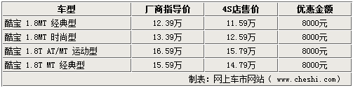 酷寶系列車型,不僅外形時(shí)尚,動(dòng)力也相當(dāng)充沛,不僅可與進(jìn)口跑車如蓮花競速相媲美,也帶動(dòng)了自主跑車市場的競爭。近期網(wǎng)上車市網(wǎng)站了解到,隨著市場競爭的加劇,現(xiàn)在各家4S店均可給出全系8000元的現(xiàn)金優(yōu)惠,令此車型再次引起關(guān)注。具體詳情如下: