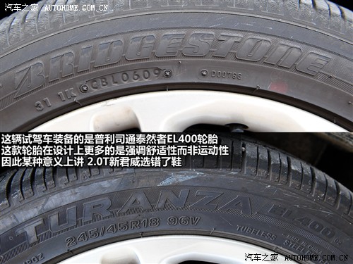 但使用了18寸的輪轂,新君威是不是就足夠運(yùn)動(dòng)了呢?輪胎的選擇是非常重要的因素,新君威錯(cuò)誤地選擇了一款普利司通的泰然者EL400型245/45 R18 96V輪胎,非常遺憾,這款輪胎的側(cè)重點(diǎn)是舒適性而非運(yùn)動(dòng)能力,抓地力不足,在2.4旗艦版上或許還不是大的問(wèn)題,但對(duì)于2.0T發(fā)動(dòng)機(jī)則不能很好地發(fā)揮它的性能。
