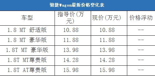 近日,編輯從華晨中華4S經銷商處了解到,駿捷Wagon有少量現車,部分車型需要預定,最多等待1個月就可以提車,定金為5000元。據經銷商透露,目前這款車沒有任何現金優(yōu)惠,需要消費者到店內與銷售人員詳談才能爭取少量優(yōu)惠。以下是駿捷Wagon最新價格變化表: