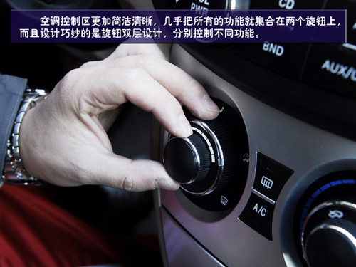 空調(diào)控制區(qū)就更加簡(jiǎn)潔了,幾乎把所有的功能就集合在兩個(gè)旋鈕上,而且設(shè)計(jì)巧妙的是旋鈕雙層設(shè)計(jì),分別控制不同功能。但在使用時(shí)我們發(fā)現(xiàn)旋鈕的指示標(biāo)是一個(gè)小的凹槽,在光線不足是可以看到是一個(gè)小燈,但在白天時(shí)這個(gè)凹槽并不十分明顯,可能會(huì)造成讀取的小障礙。