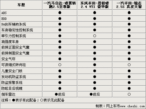 隨著汽車市場的日益成熟,安全能力逐漸也成為了車主最為關(guān)心的問題。可以看出ABS+EBD和6安全氣囊均成為了這三款車型的標準配置。但仔細看下來,睿翼轎跑和思鉑睿的配置還是更加的全面,在配備后倒車雷達同時還配備了前部停車雷達,,進一步保證停車時的安全。值得一提的是這三款車型都配備了車輛行駛動態(tài)控制系統(tǒng),該項配置可以大大的降低車輛行駛中,因側(cè)滑而發(fā)生的事故,尤其是睿翼轎跑和銳志還配備了牽引力控制系統(tǒng)。在細節(jié)方面三款車同樣十分到位,都配備的后排兒童安全門鎖、防眩目后視鏡等。