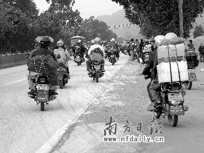 戴上頭盔、披上雨衣、載上家人,回家過年。春節(jié)臨近,由佛山、東莞、廣州等珠三角城市返鄉(xiāng)農(nóng)民工組成的10萬“摩托車返鄉(xiāng)大軍”,沿著321國道返回廣西、貴州、湖南和四川老家過年。他們穿著厚實的棉衣,結(jié)實的綁腿,棉質(zhì)護(hù)膝,防風(fēng)頭盔,皮手套,或成群結(jié)隊,或獨馬單騎,車上大多數(shù)是小兩口子,或者夾帶一個小孩,奔馳在國道上,成了春運(yùn)交通線上一道道特殊的風(fēng)景。
