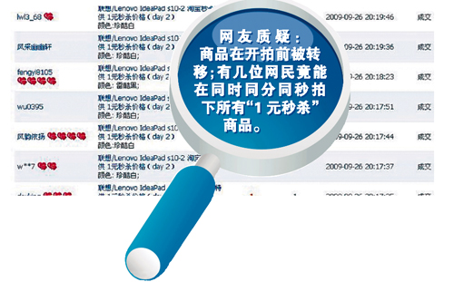 淘寶的安民公告,仍然為部分網(wǎng)友所不能接受。天涯網(wǎng)友“秋風月無痕”認為,淘寶沒出面解釋何以有三人能在同一分同一秒同時秒下三件商品!皟(nèi)有種種怪異之事,不得不讓人想到這是一場欺騙廣大中國人民的炒作行為。如果淘寶不能給出合理的讓人信服的解釋,那么最終受害的不單單是廣大受騙的群眾,更是淘寶網(wǎng)。” “秋風月無痕”及幾名網(wǎng)友隨后在跟帖中貼出當晚截圖,聲稱既然當晚人太多,“不能正常瀏覽頁面”,而實際上商品已經(jīng)在20時03分之前下架,但網(wǎng)友卻截圖發(fā)現(xiàn)有多條20時17分到20時19分的記錄,“淘寶怎么解釋這幾條記錄,03分到17分之間是空的,但是17分到19分之間突然冒出幾條記錄,這能讓人不懷疑是做了手腳嗎?”
