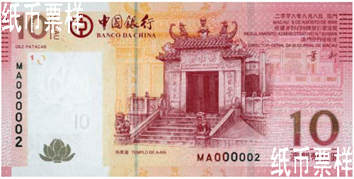 10元、20元、50元、100元、500元、1000元六種面值的主景圖案按歷史脈絡編排,分別是媽閣廟、大三巴牌坊、崗頂劇院、東望洋炮臺、鄭家大屋和民政總署大樓。鈔票背面以澳門中國銀行大廈為主景圖案,襯景選取澳門四座大橋形象,寓意澳門在中西方文化交流中和澳門元在澳門經(jīng)濟發(fā)展中具有的橋梁作用。