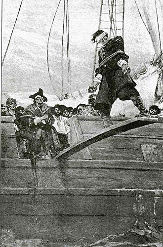 關(guān)于近代西方海盜的殘忍,人們?cè)诤萌R塢電影中有所領(lǐng)教,似乎他們最慣用的虐殺手法就是從船舷上伸出一塊木板,然后強(qiáng)迫被蒙上了雙眼的船員們一個(gè)個(gè)走上去,可憐的船員們不知道自己何時(shí)會(huì)踏空落入大海,臨死之前幾乎無法忍受黑暗中的恐懼;看著他們的犧牲品最終一個(gè)個(gè)慘叫著跌向深淵,海盜們不禁會(huì)發(fā)出刺耳的狂笑。