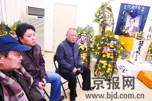 張文順先生的靈堂設(shè)在天橋樂(lè)茶園旁邊的德云書(shū)館里,面積不大但布置得整潔肅穆,張文順生前的一張黑白照片擺在靈堂正中,左右兩邊是郭德綱親筆書(shū)寫(xiě)的挽聯(lián),花籃和花圈圍繞著整個(gè)靈堂,兩邊的墻上則掛滿(mǎn)了張文順的徒弟張德武、德云社演員何云偉、李菁等人書(shū)寫(xiě)的祭幛。