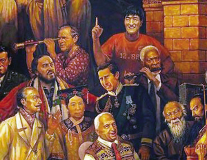 這幅畫可謂讓網(wǎng)友們開了眼,從來沒見過誰把如此眾多中外知名人物畫在一幅畫面中的,更何況還把這些名人們拼接得如此妙趣橫生、天衣無縫,大有天下大同之感。恐怖分子拉登就站在布什身后,成吉思汗和拿破侖并駕齊驅(qū),搖滾明星崔健站在慷慨激昂的列寧身后,而他旁邊就是手拿書卷的希臘行吟詩人荷馬,而亞里士多德的手正扶在比爾·蓋茨的肩上,比爾·蓋茨身前是球王貝利,就在他的旁邊,手拿大刀的關(guān)云長和希特勒一起在聆聽貝多芬的琴聲,不遠(yuǎn)處雷鋒叔叔帶著他熟悉的笑容望向畫面之外,而在畫面中央的圓桌旁,斯大林和達(dá)·芬奇則比鄰而坐,毛澤東和林肯促膝而談……簡直就是一幅世界名人的全家福。