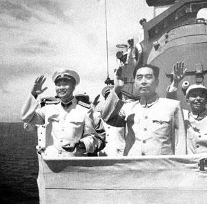 當(dāng)天,離閱兵還有一小時(shí),青島海軍基地機(jī)關(guān)、學(xué)校、部隊(duì)組成的軍官隊(duì)伍已經(jīng)整整齊齊地排列在碼頭上。東海艦隊(duì)司令員陶勇率領(lǐng)的我國(guó)自行裝配的護(hù)衛(wèi)艦“昆明”號(hào)和另一艘軍艦也由上海趕到青島,接受總理的檢閱。9時(shí)許,周總理一行在肖勁光的陪同下來到了碼頭。