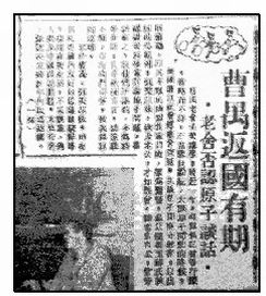 曹禺老舍去美國講學(xué),將近一年,報(bào)間偶記彼等行蹤,皆略而不詳。正當(dāng)舉世紛紜,大議原子彈的時(shí)候,美國通訊社曾傳老舍談話,主張?jiān)訌棏?yīng)守秘密,以出制蘇聯(lián)。以其不類此幽默作家口吻,群為驚怪。最近隨馮玉祥氏挾國的吳組緗,到美以后,詢及老舍,才知誤會。據(jù)老舍自云,曾旁聽歐美科學(xué)家討論原子問題,事誠有之,但他們所講的,多為科學(xué)術(shù)語,且多歐洲方言,聽還聽不懂,豈有班門弄斧,發(fā)表談話的道理。
