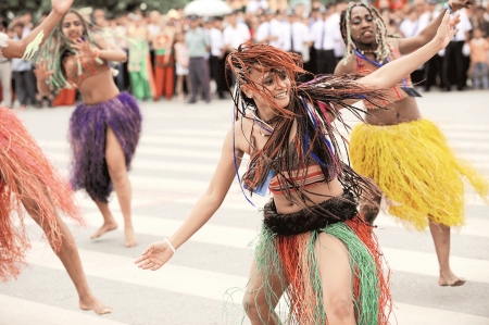 第二篇章“異國(guó)風(fēng)情”中,毛里求斯和巴基斯坦表演隊(duì)排練得很投入,當(dāng)頭戴紅花、身著艷麗花朵大擺裙的非洲美女一上場(chǎng),便吸引了現(xiàn)場(chǎng)男士們的視線。伴隨著歡快的音樂,姑娘們翩翩起舞,不停擺動(dòng)小蠻腰來回旋轉(zhuǎn)舞動(dòng),撩動(dòng)裙擺露出迷人雙腿,她們臉上的太陽(yáng)、月亮圖騰展現(xiàn)了原始的舞蹈魅力。除了這兩支隊(duì)伍,哥倫比亞民間舞、蘇格蘭風(fēng)笛、俄羅斯民間舞、泰國(guó)舞也將亮相天府大巡游。