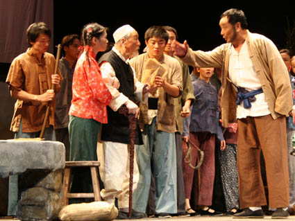 2005年9月6日至8日,由中國文聯(lián)主辦的紀(jì)念中國人民抗日戰(zhàn)爭暨世界反法西斯戰(zhàn)爭勝利60周年優(yōu)秀劇目展演抗戰(zhàn)獨(dú)幕劇專場在中央戲劇學(xué)院實(shí)驗(yàn)劇場上演。91歲高齡的山尊老不僅擔(dān)任專場演出的總策劃,還在《求雨》中扮演一個回族老人宋大爺,這個形象設(shè)計(jì)是為了表現(xiàn)全國各族人民團(tuán)結(jié)一致抗戰(zhàn)的決心。由于老人家年事已高,而在劇中還有一個磕頭的場面,因此在人物設(shè)計(jì)上,將由一個“小孫女”攙扶上場。當(dāng)大家關(guān)心他是否一定要出演這個動作時,老人說:“磕頭這個場面我一定要演,而且可以演,但是在起身的時候,可能要人扶一把!彼木礃I(yè)精神感動了所有年輕的演員。本報(bào)組織員工專門到劇場觀看了這場演出,山尊老對藝術(shù)的執(zhí)著精神和要牢記歷史、珍愛和平的諄諄教導(dǎo)讓大家非常感動。演出結(jié)束后,報(bào)社向山尊老敬獻(xiàn)了花籃,祝福老人家健康長壽、藝術(shù)生命長青。山尊老欣然與大家合影留念,并高興地說,謝謝報(bào)社對我的關(guān)心,謝謝你們!