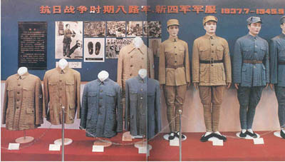 抗戰(zhàn)爆發(fā)后,紅軍改編為八路軍、新四軍,服裝、標(biāo)志基本與國(guó)民黨軍隊(duì)相同。八路軍、新四軍都佩戴“青天白日”帽徽,但臂章上卻清楚地標(biāo)明了自己的身份。八路軍佩戴“八路”長(zhǎng)方形臂章,新四軍佩戴“新四軍”或“N4A”的臂章。八路軍的軍服顏色多為土黃色,新四軍多為灰色。