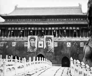 毛主席在天安門城樓上,領著與會者高呼:“中國人民萬歲!”“全國人民團結起來!”“打倒帝國主義!”“建立新中國!”“全世界人民團結起來!”“打倒帝國主義的走狗中國反動派!”“召開新的政治協(xié)商會議,成立民主聯(lián)合政府!”“爭取全世界的和平、民主!”