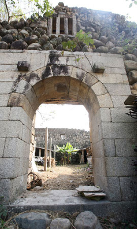 石堡是一個長方形建筑,長37米、寬31米,墻體內(nèi)外全是用鵝卵石及條石砌成,歷經(jīng)數(shù)百年風雨,雖說已經(jīng)沒有了屋頂,只留下高約8米的墻基,但依然雄偉屹立。石堡的三面是護厝房,外墻也是石頭,但內(nèi)墻是由土夯成的,非常牢固,石堡大門上陰刻“懷珠”兩字。