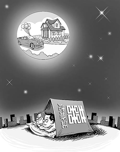 不買房,不買車,不辦婚禮,不買婚戒……除了花九塊錢去登記處辦理紅艷艷的結(jié)婚證,其他都可以不要。近來,網(wǎng)絡(luò)上的一篇題為“一個裸婚者的自白”的帖子,引發(fā)網(wǎng)友關(guān)注!奥慊椤,這個在2008年全球金融危機下誕生的新詞兒,在2009年不斷上揚的房價“助推”下迅速流行。新浪網(wǎng)網(wǎng)友“同道”稱,“‘裸婚’是高房價賜給白領(lǐng)的‘新時尚’!