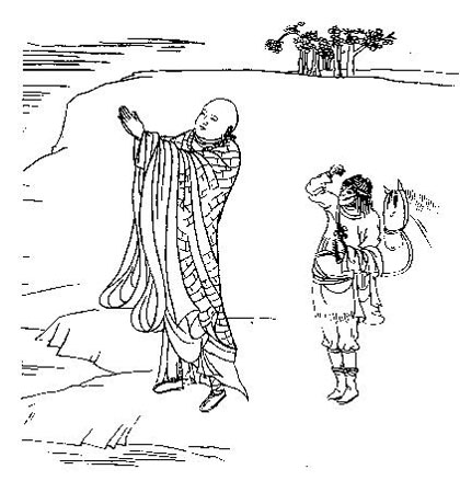 在榆林窟第2窟、第3窟、第29窟及東千佛洞第2窟內(nèi),都繪制了這樣一幅壁畫:一名出家人面對洶涌的河水雙手合十,身后長著猴相的弟子牽著一匹馱經(jīng)老馬,遠(yuǎn)處有一片樹林。