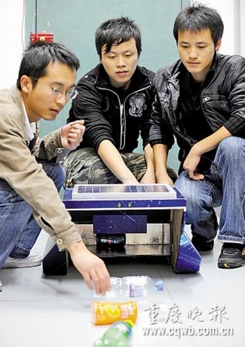 “我們發(fā)明的機器人會撿礦泉水瓶和塑料袋,還會掃地……我們將把它作為畢業(yè)紀念品送給學校!弊蛉(10月29日),重慶交通大學機電與汽車工程學院的大四學生胡偉平、謝敬濤、王定坤等五位同學將發(fā)明的“保潔機器人”贈送學校,作為回報母校的禮物。
