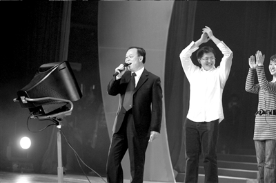 略顯緊張的周校長(zhǎng)“喝口水”的要求得到滿(mǎn)足后,便從衣袋里掏出一張寫(xiě)有歌詞的白紙,正式開(kāi)唱。他手握麥克風(fēng),緊盯臺(tái)上的卡拉OK屏幕,高潮處他還會(huì)踮起腳尖“飆高音”。此時(shí),上任校長(zhǎng)許智宏微笑著坐在臺(tái)下,隨聲輕和。