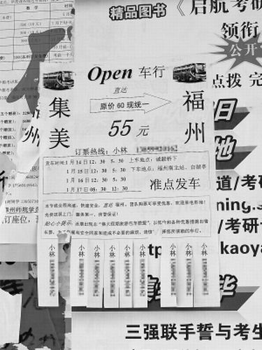 昨日(1月15日),記者走訪廈門幾所高校發(fā)現(xiàn),在學(xué)校餐廳、宿舍樓、廣告信息欄等多處地方都貼了很多包車業(yè)務(wù)的小廣告,大部分留下的都是校內(nèi)學(xué)生的聯(lián)系電話,目的地一般是福州、三明、南平等地。記者從包車廣告上看到,每天最少有兩個(gè)車次,最多高達(dá)4個(gè)。