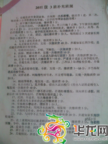 如此多的學生被扣分、罰款,其依據(jù)是什么?在班上同學的指引下,記者在該班教室進門靠左的墻上看到兩張《2011級3班補充班規(guī)》,班上同學告訴記者:該班規(guī)就是扣分、繳罰款的依據(jù)。