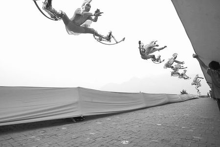 昨天,記者驅車趕到登封。雖然剛集訓完,在塔溝武校的訓練場上,220名學員仍馬不停蹄地訓練。在一面寬50米、長60米的巨幅國旗下,“彈跳小子”們身輕如燕,姿勢優(yōu)美(如圖)。