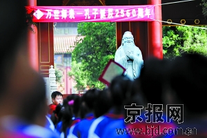 “拜,興,禮成!”今天是孔子誕辰2560周年紀(jì)念日,上午,孔廟舉行了傳統(tǒng)的拜師禮活動(dòng)。國(guó)子監(jiān)中學(xué)初一年級(jí)的160名學(xué)生在孔廟大成門舉行了拜師禮。