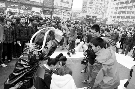 河南商報(bào)報(bào)道因發(fā)帖指責(zé)鄭州艾迪美文化傳媒有限公司(以下簡稱艾迪美公司)不退還押金,是個(gè)“騙子”,4月7日,發(fā)帖者稱遭到了該公司人員皮帶抽、拳頭打的噩運(yùn)。昨天,發(fā)帖者和部分受害者在二七廣場聚會,以“行為藝術(shù)”再現(xiàn)艾迪美公司打人的場景。
