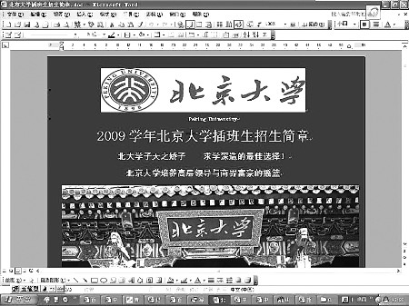 中凰天龍發(fā)來的招生簡(jiǎn)章介紹說,北京大學(xué)插班生是指跟隨北京大學(xué)全日制本科生一塊學(xué)習(xí)、活動(dòng),僅是一次享受北大的文化氛圍,提升自身的知識(shí)水平的學(xué)習(xí)過程,畢業(yè)只頒發(fā)結(jié)業(yè)證,不屬于統(tǒng)招范疇。學(xué)生擁有聽課證,可以選擇專業(yè)跟讀。除了給招生代理公司交中間服務(wù)費(fèi)外,學(xué)生還要向?qū)W校交學(xué)費(fèi)7000元 /年、學(xué)雜費(fèi)3000元、床位費(fèi)500—600元/月等多項(xiàng)費(fèi)用。