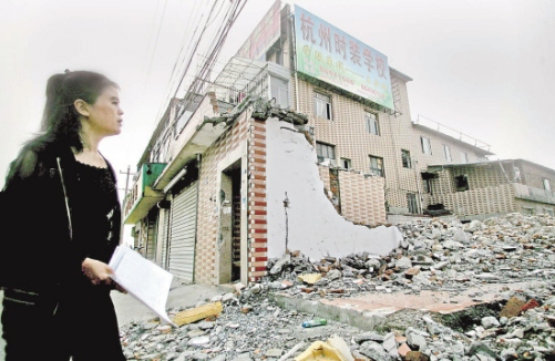 杭州彭埠鎮(zhèn)備塘路西邊是一大片廢墟,因?yàn)榛疖嚃|站樞紐工程建設(shè),這里大片房子都拆走了。廢墟中,卻有一幢四層樓孤零零地站著。很少有人知道,這是一所時(shí)裝學(xué)校,學(xué)校里至今還有100多人在上課。由于四周房子都拆走了,學(xué)校樓房墻壁上出現(xiàn)了裂縫,樓面也有些傾斜,玻璃窗也壞了。為什么學(xué)校遲遲不搬?接到讀者報(bào)料后,記者來到現(xiàn)場(chǎng)。