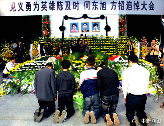 上午的追悼會由荊州市委副書記傅立民主持。長江大學(xué)黨委書記張忠家在悼詞中說,三名19歲的大學(xué)生為搶救他人生命,卻不幸離我們而去。我們?yōu)橹,為之感動。陳及時、何東旭、方招同學(xué)舍己救人的事跡震撼了古城、感動了全國!幾天以來,學(xué)校師生和社會各界人士,以多種方式表達(dá)崇敬和哀思。他們的英雄壯舉是良好的家庭教育、學(xué)校教育、社會教育和自我教育的結(jié)果。