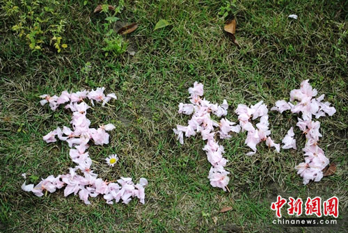 這個(gè)造型浙商大校報(bào)記者朱君想出來的。他在校園里拍攝“全國(guó)哀悼日”活動(dòng)時(shí),看到落花無數(shù),思緒一亮,就組織同學(xué)們把這些花瓣拼成“玉樹”,謹(jǐn)以這種特俗的方式悼念遇難同胞。