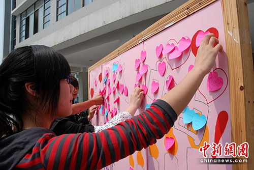 活動(dòng)現(xiàn)場(chǎng),以沒有了往日的嬉笑熱鬧,路過的同學(xué)們紛紛安靜的走過來在愛心型的紙片上寫上自己對(duì)玉樹深深的祝福,“玉樹別哭,我們永遠(yuǎn)和你在一起”,“玉樹,有希望,我們就有明天”……同學(xué)們一句句感人的祝福筑起了我們愛心的圍墻,傳遞著甌江學(xué)子對(duì)玉樹同胞那份牽掛的心情。(完)