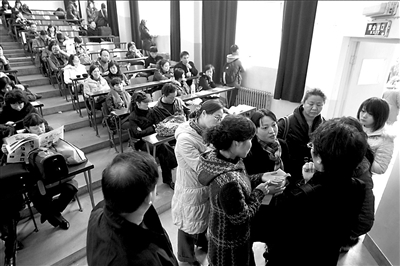 與往年一樣,今年中傳大仍推行網(wǎng)上報名,藝術(shù)類專業(yè)全部實行網(wǎng)上報名、網(wǎng)上交費、網(wǎng)上約考。由于很多考生反映未報上名,學(xué)校特意在2月7日安排人員為考生現(xiàn)場補報,但部分考生仍未能趕上這次補報。為給考生考試機會,昨天上午,學(xué)校在教務(wù)處臨時設(shè)置了一個報名點,方便學(xué)生補報。
