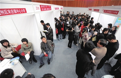 昨天,近幾年來本市首場(chǎng)中小學(xué)教師專場(chǎng)招聘會(huì)在首師大體育館舉行,1.3萬名北京高校應(yīng)屆畢業(yè)生蜂擁而至,競(jìng)爭(zhēng)132家本市中小學(xué)提供的1100余個(gè)崗位。在招聘現(xiàn)場(chǎng),市區(qū)學(xué)校攤位前人頭攢動(dòng),而郊區(qū)學(xué)校則門可羅雀,兩極分化嚴(yán)重。