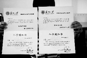 記者看到,兩份入學(xué)通知書》的大紅封面正面印有蘇州大學(xué)的校徽和“蘇州大學(xué)” 字樣。背面印有蘇州大學(xué)一建筑物照片,照片下端是校訓(xùn)。該通知書的內(nèi)頁上半部分印有關(guān)于蘇州大學(xué)的學(xué)校簡介,下半部分是告知考生錄取何專業(yè),何時(shí)報(bào)到。落款是“蘇州大學(xué)材料與化學(xué)化工部”“二OO九年八月”,并有“蘇州大學(xué)材料與化學(xué)化工部”字樣的章印。