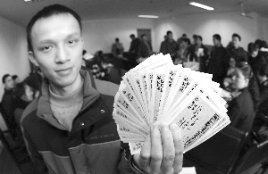記者在現(xiàn)場注意到,部分學(xué)生代表拿到同學(xué)們預(yù)訂的火車票后仍愁眉不展。環(huán)境學(xué)院07級碩士研究生石昕就拿著一疊票在登記表上核對、打鉤,不時嘆息。他們班26人訂票,只拿到了14張票,其余都沒有!安皇菦]票,是有票他們不要!笔空f,沒訂到票的同學(xué)多半是往重慶、哈爾濱等方向的,都是要求太高,指定要硬臥,坐票都不考慮。這讓火車站工作人員為了難,這些地區(qū)火車票本身就很緊,臥鋪票更加有限,非臥鋪不要的要求根本無法滿足。