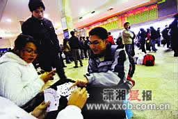 “快!17號(hào)的票出來了!”巴德浩四人撒腿就往電子屏前跑,睡意全無,但電子屏顯示,從深圳、廣州、長沙開往北京西的三趟車欄里都是空白,幾人悻悻回到學(xué)生窗口前!坝辛!有了!”聽到這喊聲,幾人再次奔過去,發(fā)現(xiàn)從長沙開往北京西的T2次列車一欄里顯示,17日還有硬座票和無座票。