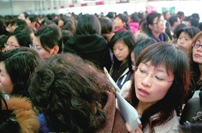 昨天(4日)上午9點(diǎn),女大學(xué)生專場(chǎng)招聘會(huì)在北京市畢業(yè)生就業(yè)市場(chǎng)舉辦。此次招聘會(huì)共有50家企事業(yè)單位參加,600個(gè)崗位提供給前來應(yīng)聘的女大學(xué)生。市人事局畢業(yè)生就業(yè)服務(wù)中心統(tǒng)計(jì),截至下午2點(diǎn)招聘結(jié)束時(shí),約5000人參加招聘,平均8人爭(zhēng)取1個(gè)崗位。