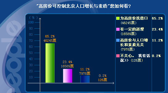 截止到14日晚21時,參與調(diào)查的網(wǎng)民共計70938人,其中有46245人認(rèn)為這是在為高房價找借口,直接質(zhì)疑任志強(qiáng)的“素質(zhì)”,持此一觀點的網(wǎng)民占總?cè)藬?shù)的比例高達(dá)65.2%。此外另有11.2%的人也明確表示房價與人口增長和素質(zhì)無關(guān)。不過,也有近四分之一的網(wǎng)民認(rèn)為任志強(qiáng)的說法"有一定道理"。