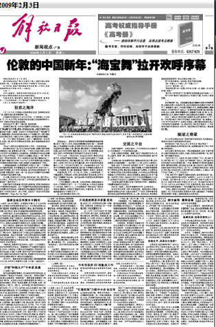 “當(dāng)時從謝斯百瑞大街到廣場滿是人,從中午12點到下午5點結(jié)束,統(tǒng)計數(shù)字是10萬人次。2004年到2005年也是10萬多人次,2006年和2007年超過20萬人次,到2008年達(dá)到30萬人次,今年又比去年增加5萬多。有意思的是,觀眾90%是倫敦本地市民和歐洲游客! 鄧柱廷翻開筆記本對記者介紹。