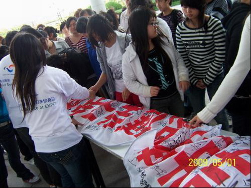 活動(dòng)現(xiàn)場,學(xué)生們踴躍報(bào)名并在“思博學(xué)子爭做世博志愿者”橫幅上簽名留言,表達(dá)了愿為世博服務(wù)的決心。