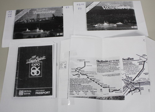 下面我分別談這兩件事的情況。當(dāng)我抵加拿大溫哥華,哥哥們 一定要我去參觀舉世矚目的1986年溫哥華世博會(EXPO),親友們很快為我購買了精致的入場券。因為每次去用車載我參觀,一參觀一整天(從上午10點(diǎn)到下午9點(diǎn)),我只去過兩次,去幾個國家地區(qū),每到一個地區(qū)、國家可蓋紀(jì)念章。這張入場券像一本護(hù)照,做得很精致,同時各個地區(qū)、國家有種種介紹的冊子。我要來不少冊子,后來在搬家中丟失了。這本“護(hù)照”留地方蓋當(dāng)日入場日期,并留了不少空白號蓋章用。我參觀了兩次(1986年5月26日及5月31日),我保存入場券上有蓋紀(jì)念章包括中國館、加拿大安大略省(法文地區(qū))、日本、馬來西亞、韓國、羅馬尼亞、加拿大、肯尼亞、澳大利亞、巴基斯坦等。我入場券號碼是0370014,首一頁是當(dāng)?shù)厥组L(籌備館負(fù)責(zé))歡迎詞,在第二頁上寫上自己的名字、地址及自己簽名,寫上三日護(hù)照(Three day passport)與皇家銀行(Royal Bank)合辦。并有一張1986年溫哥華EXPO導(dǎo)游圖,標(biāo)出80個地區(qū)、國家所在。我還有保存兩本介紹溫哥華風(fēng)景小冊子,每一本冊子包括14個風(fēng)景區(qū),每本定價1.5元。