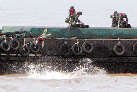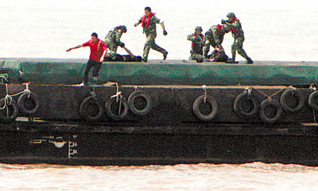 “跳幫!”一聲令下,10余名海警官兵利用兩船靠近和波浪起伏間隙最小的瞬間,飛身魚躍,紛紛越過船艇護(hù)欄,跳到貨輪上。海警擊斃一名“恐怖分子”,制伏兩人,另一名“恐怖分子”慌不擇路跳海,也被飛身入海的海警抓獲。此時藏匿在機艙的4名“恐怖分子”瞅準(zhǔn)空隙,駕艇逃竄。
