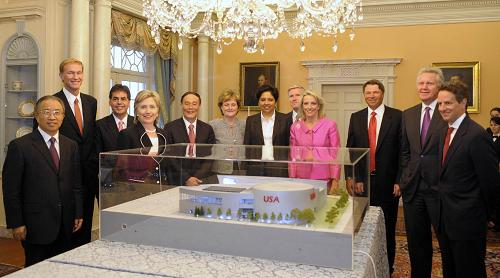 7月28日,正在華盛頓參加首輪中美戰(zhàn)略與經(jīng)濟(jì)對(duì)話的中國國家主席胡錦濤特別代表、國務(wù)院副總理王岐山和國務(wù)委員戴秉國以及美國總統(tǒng)奧巴馬特別代表、國務(wù)卿希拉里·克林頓和財(cái)政部長(zhǎng)蒂莫西·蓋特納27日在美國國務(wù)院共同為2010年上海世界博覽會(huì)美國館模型揭幕。