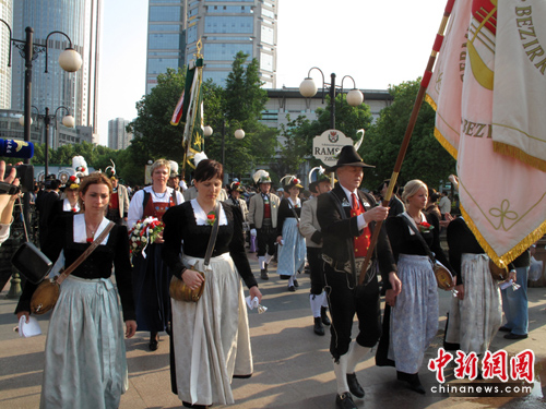 中新網(wǎng)南京5月23日電(申冉 閆正偉)今天下午,南京市中心山西路的市民廣場(chǎng)上空飄蕩著來(lái)自?shī)W地利美麗山崗原野間的優(yōu)美圓舞曲,穿著奧地利民族服裝的奧地利施瓦茨市長(zhǎng)樂(lè)團(tuán)樂(lè)手們帶著他們淳樸悠揚(yáng)的旋律和歡快自由的舞步,給南京市民送來(lái)了一個(gè)充滿著奧地利音樂(lè)狂歡節(jié)日氣氛的初夏周末。