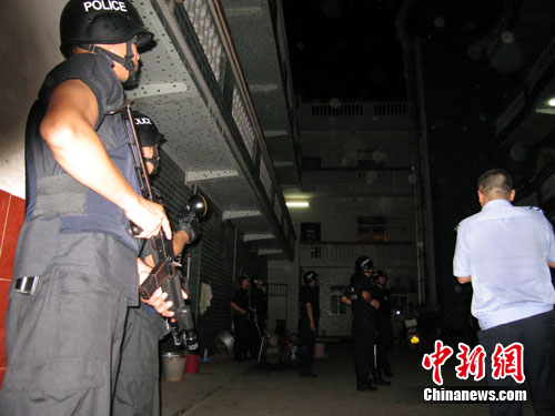 凌晨1時(shí)許,南寧市公安局局長(zhǎng)廖洪濤與副局長(zhǎng)吳宏飛率領(lǐng)數(shù)十輛滿載警察的車輛,飛速駛往橫縣。中新網(wǎng)記者跟隨這些全副武裝的特警和巡警等警種一同前往。