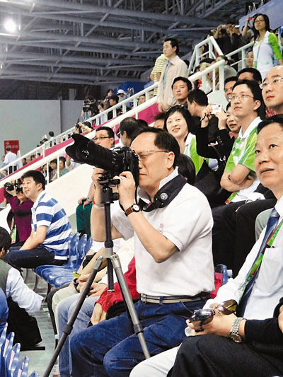 記者留意到,曾蔭權(quán)的“長槍”主要用來拍攝比賽場景及運(yùn)動(dòng)員。在橄欖球比賽現(xiàn)場,他也用單反相機(jī)拍攝坐在他對面的手持特區(qū)區(qū)旗吶喊助威的香港觀眾。到了跳水比賽現(xiàn)場,他更架起三腳架,鏡頭由上至下追拍運(yùn)動(dòng)員從起跳到落水的每一個(gè)瞬間。每拍完一輯相,他都要仔細(xì)閱覽一番,更不時(shí)指著照片與身邊的人分享。發(fā)燒友“特首”十分寶貝他的裝備,離開廣州前,也親自將相機(jī)同鏡頭拆分,分開擺放,不假手他人。