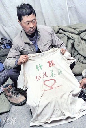 “眼看手勿動(dòng)!”記者欲一睹黃福榮日記,男子立即阻止:“不行,我要將黃大哥的日記,親手交給他的家人!笔殖秩沼浀慕欣顦渲,是內(nèi)地一家社福機(jī)構(gòu)的救災(zāi)義工,與阿福結(jié)緣于汶川地震,“我不單有黃大哥的日記,還有他在災(zāi)區(qū)穿過的T恤”。
